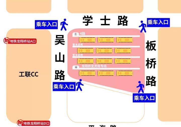回归之后,乘坐公交车方便吗?龙翔桥公交车站被学士路、板桥路、吴山路包围,共设置了四个出口可供线路换乘。记者从龙翔桥地铁站进行换乘,从A出口往外走经过工联大厦的下沉广场一路往上,有两个选择,一方面可以往右穿过工联大厦的通道进入车站,另一方面可以往左走学士路,学士路和菩提寺路交叉口有一个醒目的入口,经学士路往板桥路可以看到第三个入口。