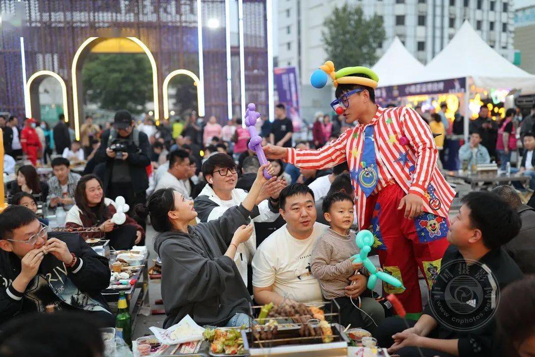 “小丑”小伙在烧烤场内用礼物给吃饭的人们带来笑容。