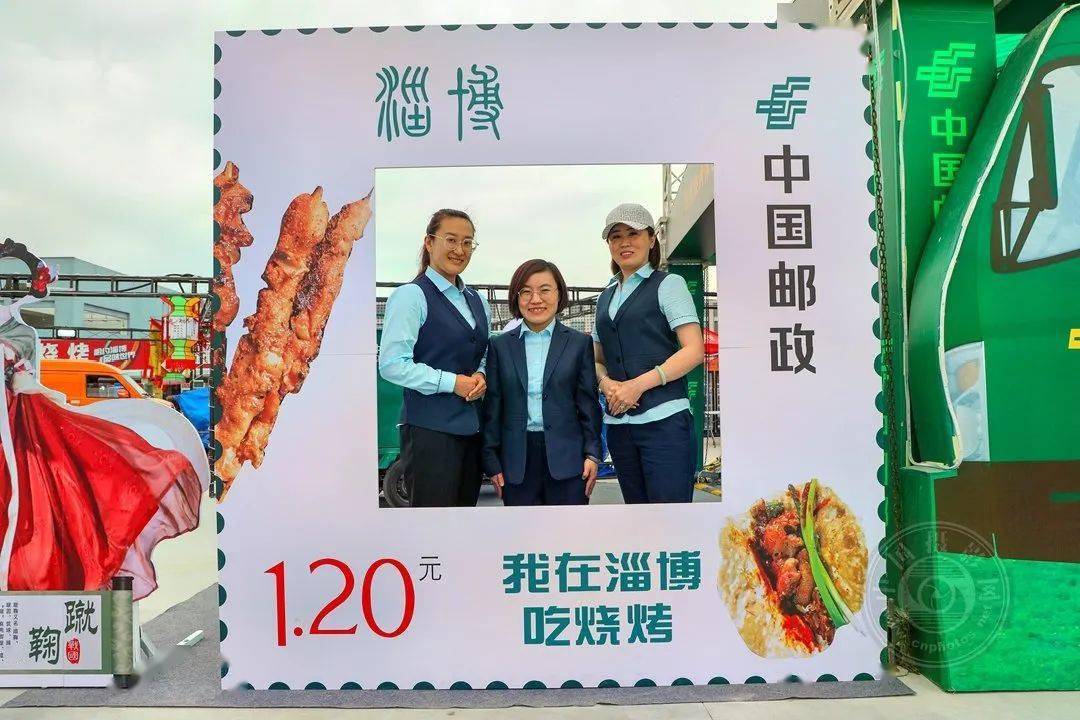 各种类似邮票样子的烧烤元素布满烧烤城,邮政工作人员在此拍照。
