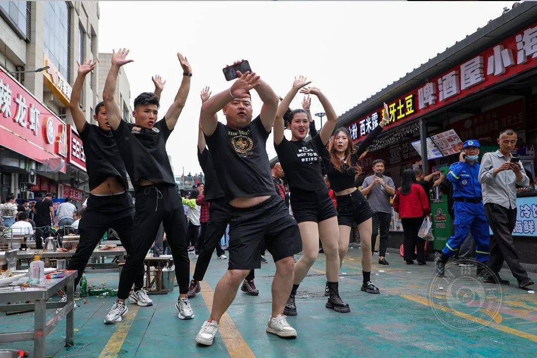 五一假期期间,每天进淄“赶烤”人数达到20万人,在著名网红打卡地“牧羊村烧烤”,边吃边舞的人们。
