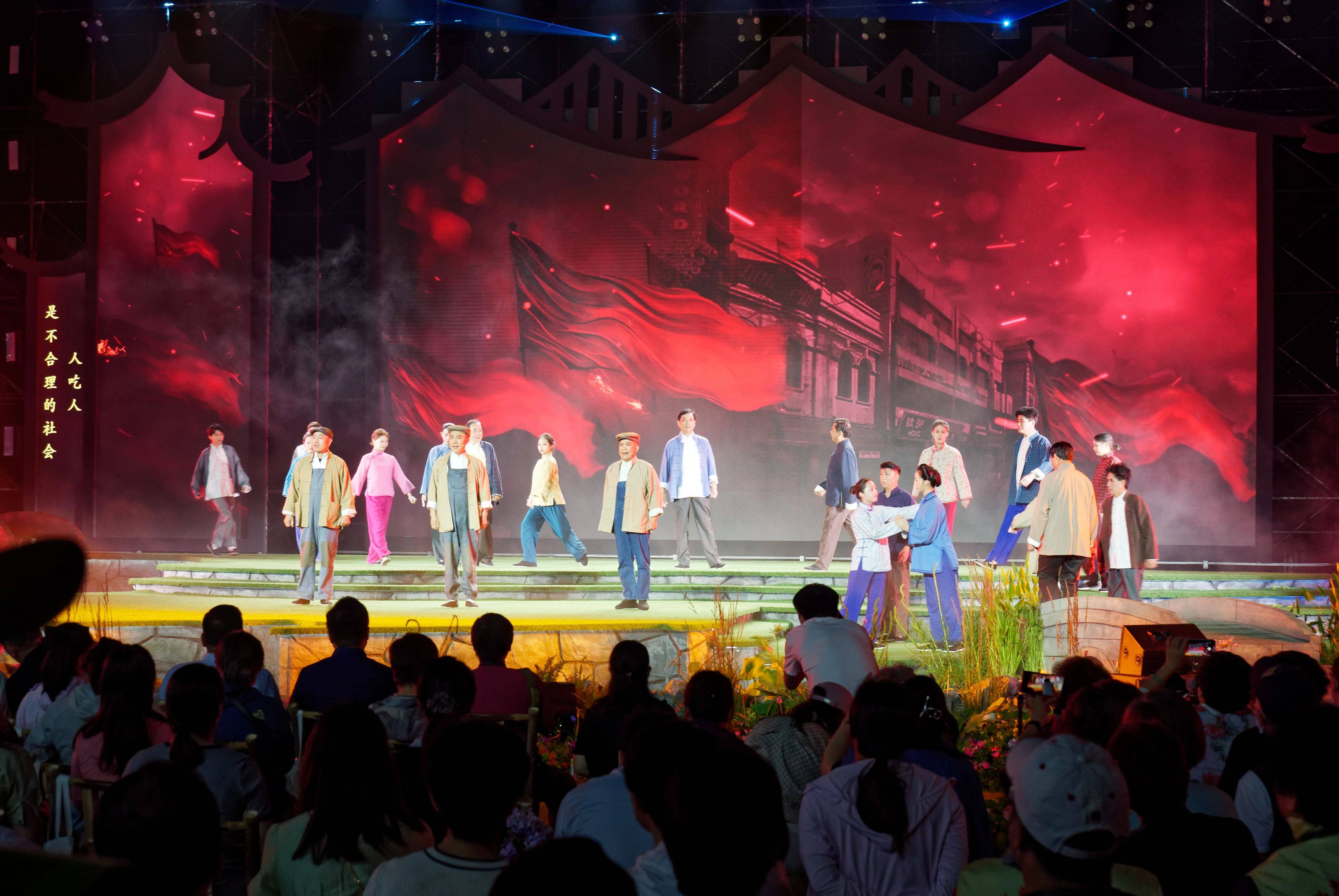 田野间的主舞台后方,三块异形的大屏装饰成海派乡村楼房的形状,与四周的乡村农舍呼应。丰富的演员通道打破了传统的舞台限制,并将沪剧艺术与前沿技术并置,营造出令人耳目一新的艺术效果。