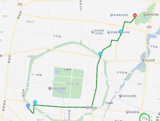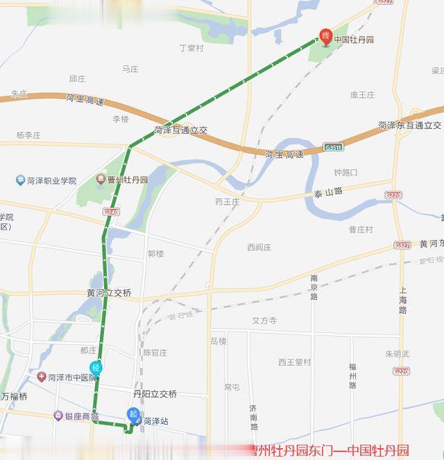 线路走向:百货大市场(西客站)—中山路—点将台—中华路—牡丹路—兴民南路—大学路—太原路—万花湖路—牡丹北路—曹州牡丹园西门