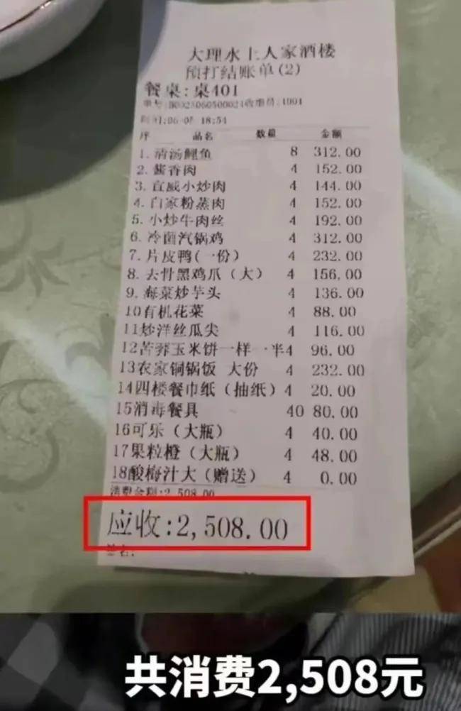 一名网友声称在大理用餐时被严重敲诈勒索。该网友来自浙江,与其他39人一同前往大理旅游,共点了四桌菜品,但总消费金额高达2508元。该网友还公布了购物清单,希望其他网友一起评议。