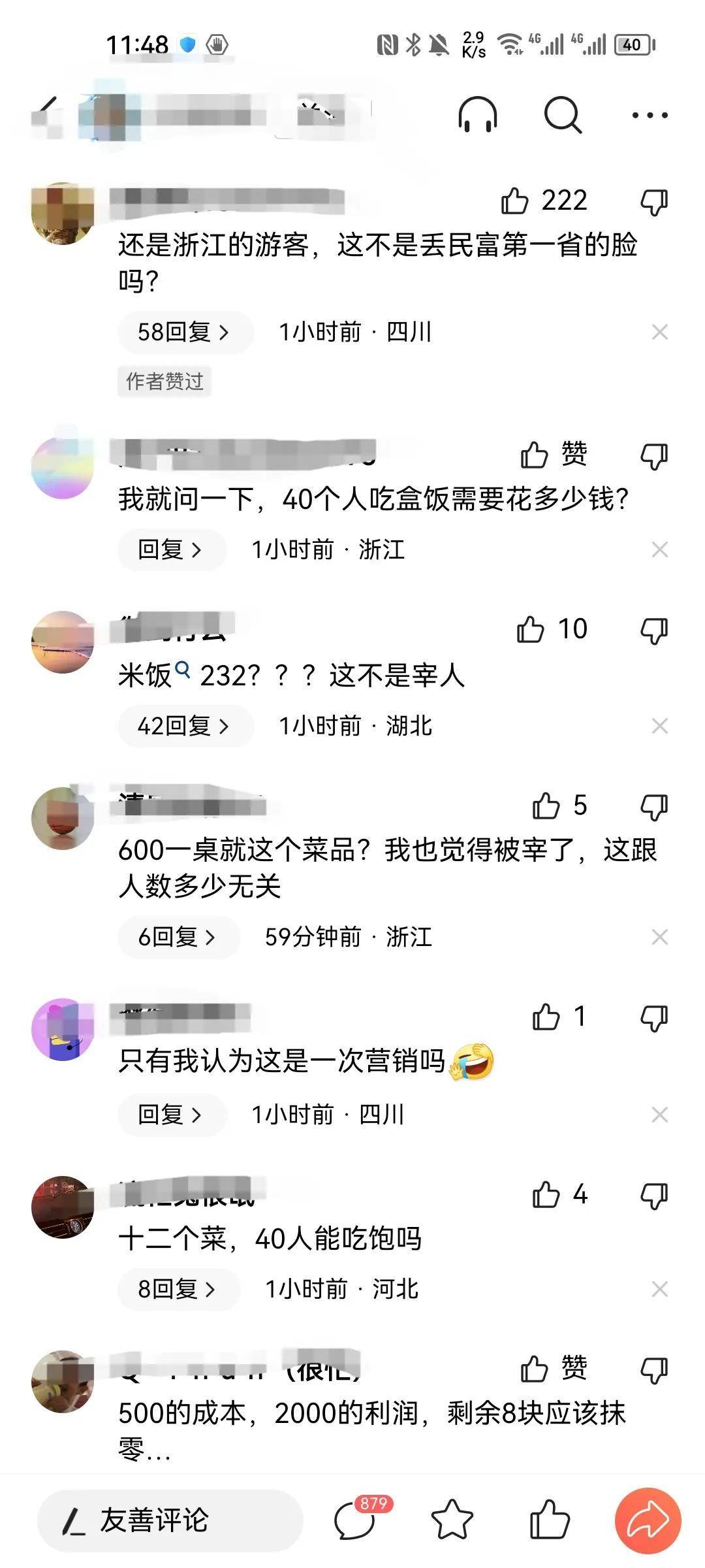 然而,12道菜中竟有六道为荤菜,加上菜品的数量之多,这份账单600多元的确算不上贵。也有一些网友对这些鄙视,调侃道:难怪是从浙江来的,浙江还是省富的呢,能便宜点就便宜点吧。