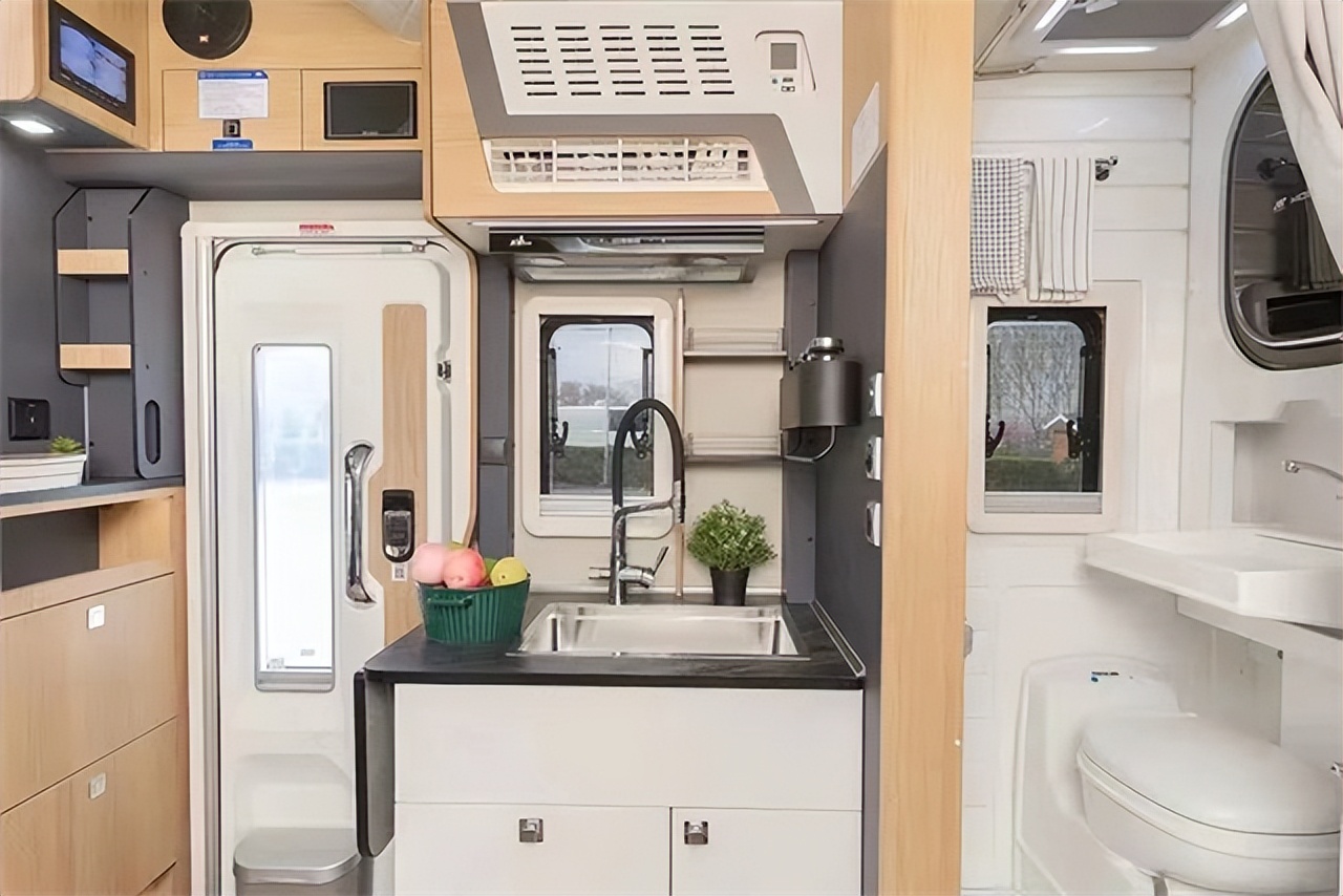 厨房配备水槽,水龙头、储物柜,微波炉,赛特福德142升车载冰箱,容量大可以储存三到四天的食物量。整车配有800AH锂电池、3000W充逆变一体机,CO及烟雾报警器,2Kg灭火器,为你的旅途保驾护航!卫生间吸塑一体,防水防霉易打理。赛特福德旋转马桶,水槽,3公升洗烘一体机,还有灯带换气扇,晾衣杆,镜子,淋浴花洒等硬件设施还是比较全的。