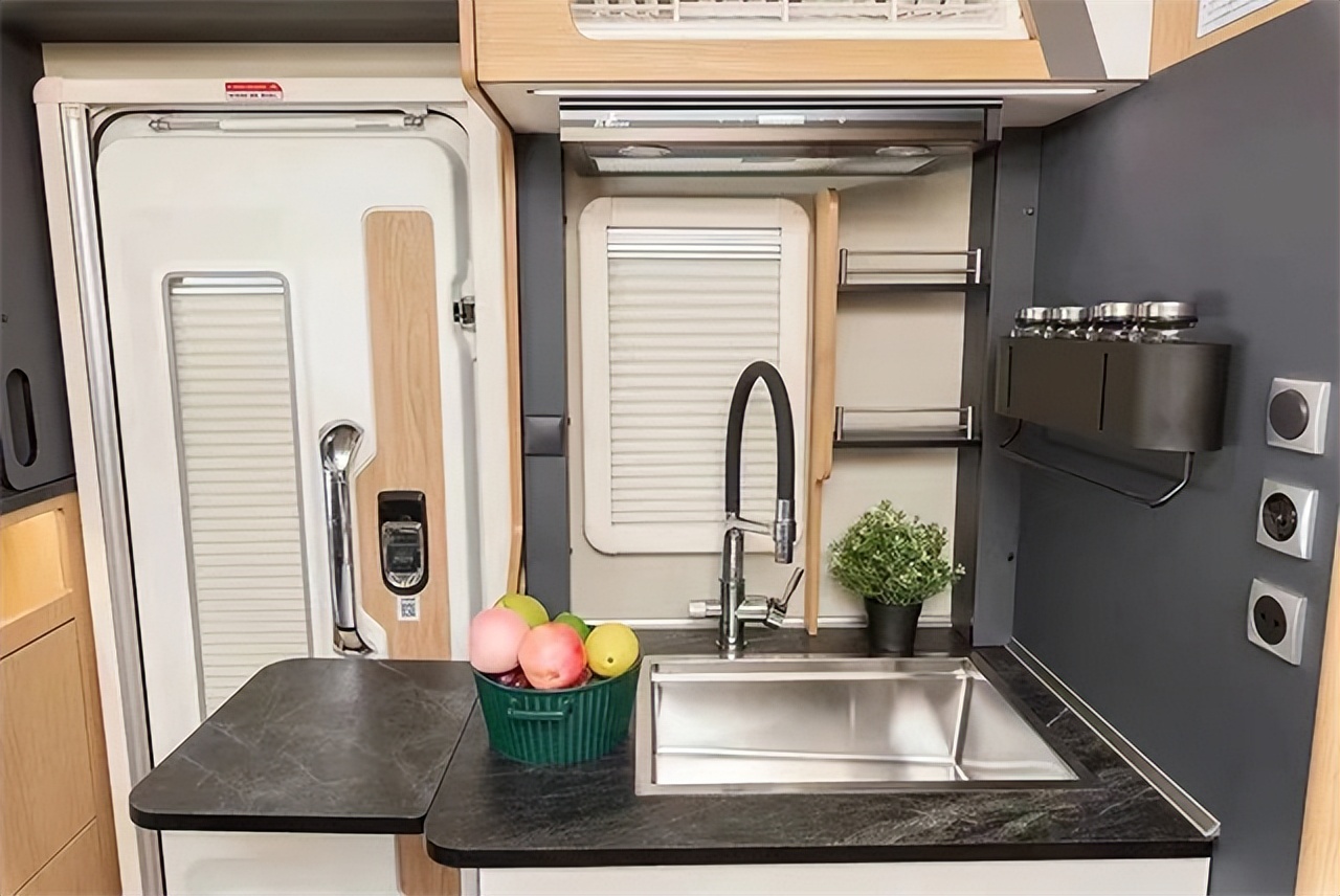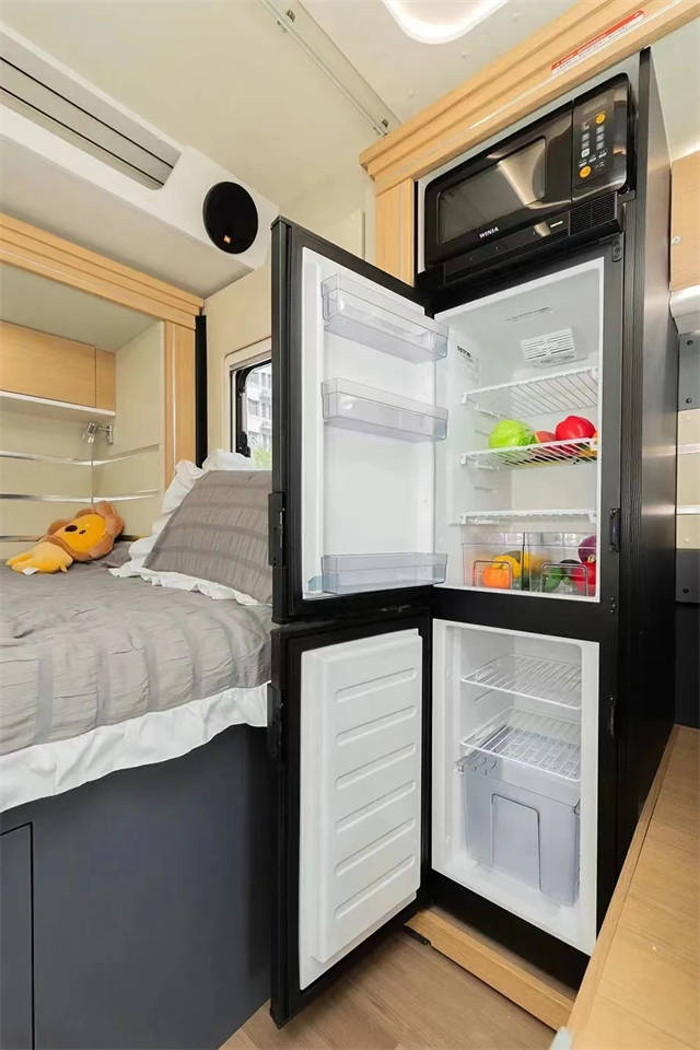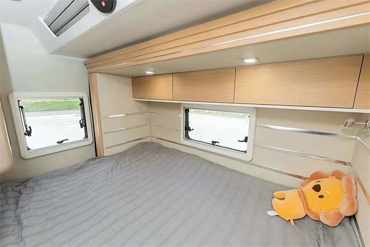 尾横床可拓展,拓展后尺寸为2210x1360mm,侧面阅读灯、电源插座、USB接口、车窗配备齐全,营造舒适的睡眠空间;顶部还有一排吊柜,提供充足的储物空间。水电方面配置了3kw(150A)的充逆变一体机,840w太阳能电池板,800Ah房车专用锂电池,可以外接220V市电,220L的超大净水箱,可以满足4人两天的使用需求!