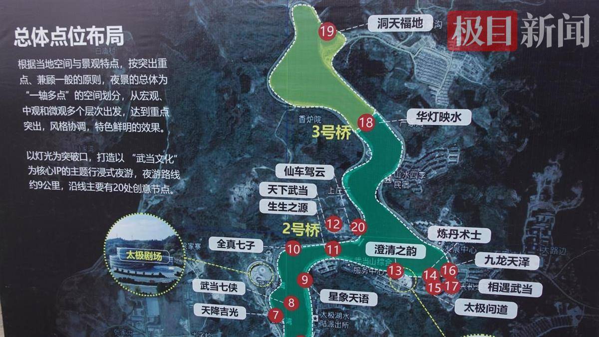 120名工人在太极湖新区1号桥、新区沿湖道路、山湖樾小区、武当武术国际交流中心等地施工。宝典电气集团有限公司常务副总经理、武当山夜游文旅综合体项目总经理徐旭介绍:“目前我们沿线的3.5公里河岸亮化以及将近8公里的岸线亮化已经全面施工,整个15栋的主体建筑已经点亮了4栋。预计到这个月底,主体建筑基本都能呈现。”