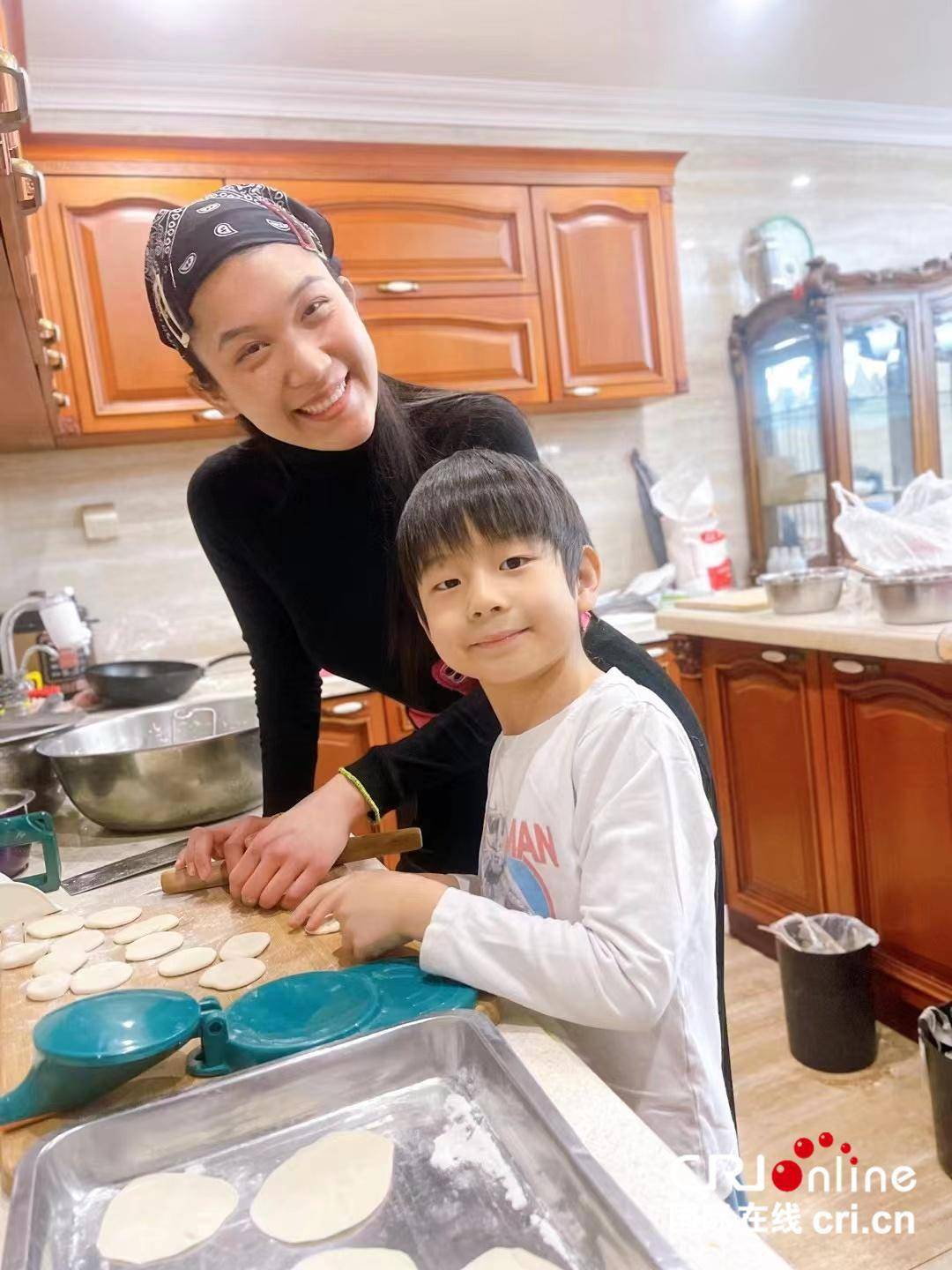 雪莉和儿子在家包饺子