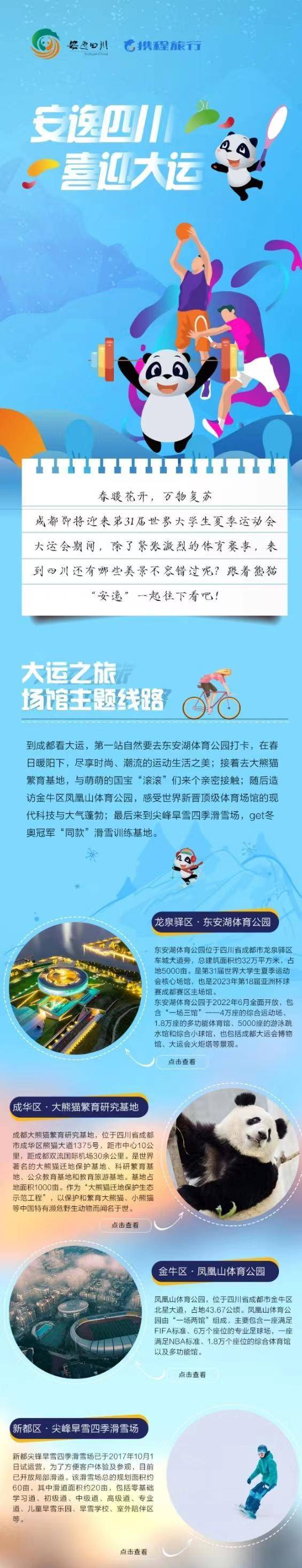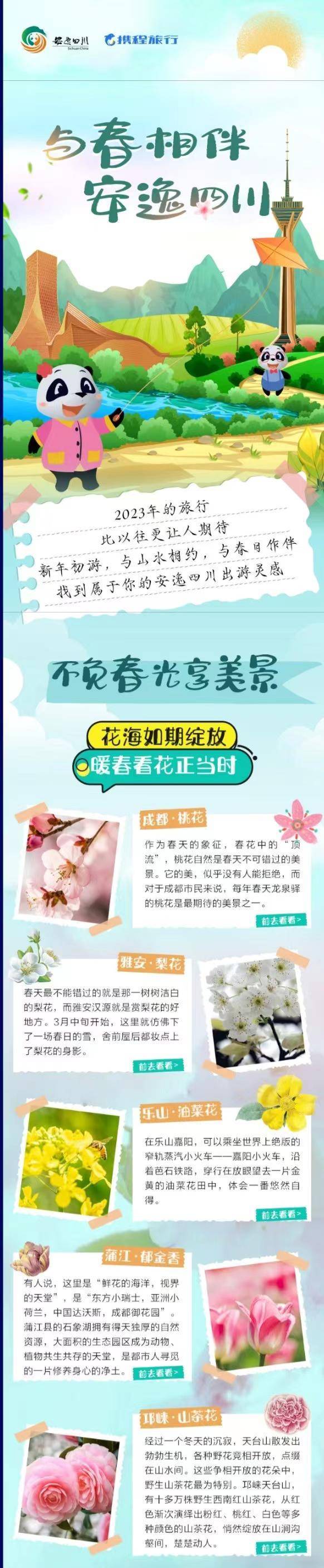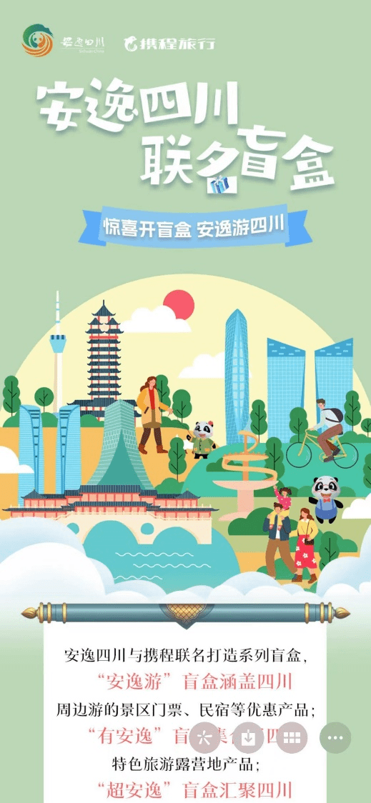 自2019年以来,携程集团与四川文旅携手,在产业共建、文旅品牌全球推广以及旅游大数据等方面展开合作,通过一系列及时有效的文旅举措和营销创新,为四川旅游市场的全面复苏提供了强劲的助力。2022年11月起持续到2023年春季,携程集团为四川量身定制了“趣游安逸”营销合作项目。该项目发布了"安逸四川"旅行记忆文创榜单,并结合四川文旅熊猫"安逸"的IP形象,打造了具有四川文旅特色的IP联名形象。