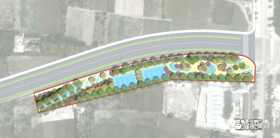 游园以“运动健身,绿色赞皇”为主题,以“全民健身、运动不止”为口号,采用彩色运动地面结合绿色植物景观的手法,建设一条具有运动特色的城市绿带。