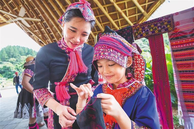 6月10日,五指山市水满乡毛纳村,一名小女孩学习刺绣。 通讯员 孟志军 摄