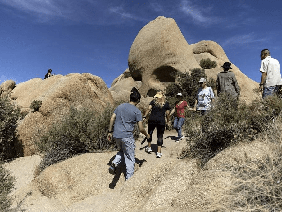 美国加州尤卡谷附近,游客在约书亚树国家公园攀爬岩层。