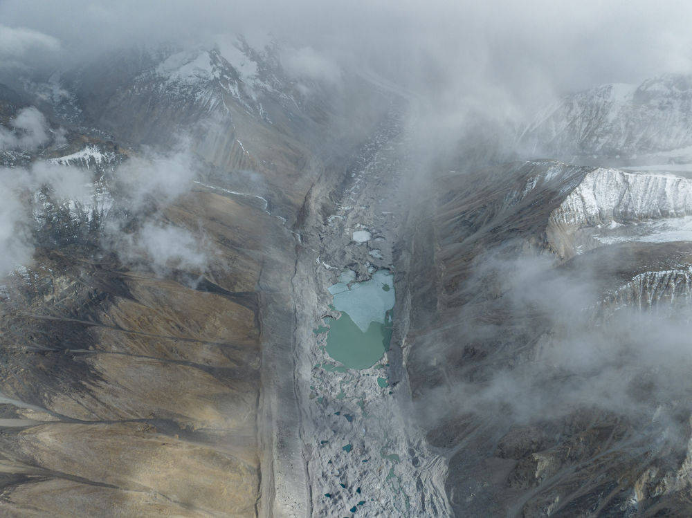 这是在海拔7000米左右高空拍摄的由绒布冰川融水形成的湖泊群(5月25日摄)。