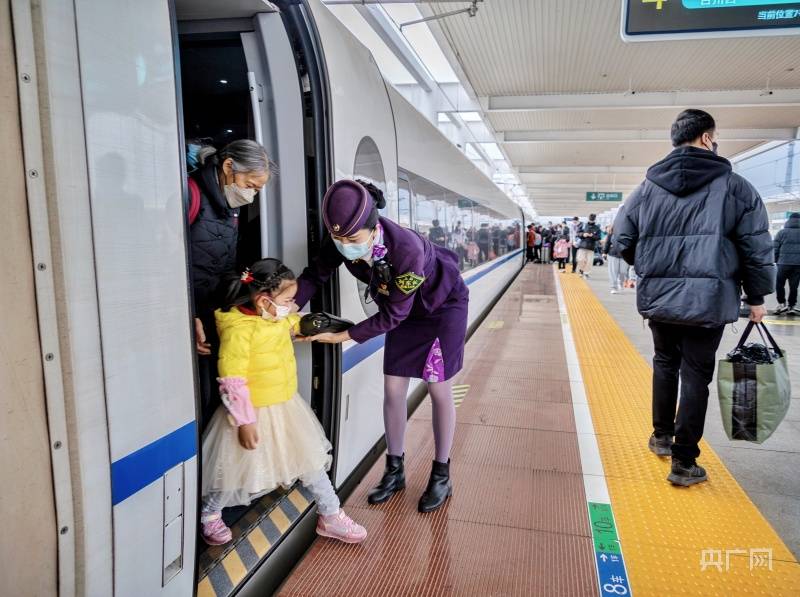 乘务员协助旅客下车(央广网发 李忱 摄)