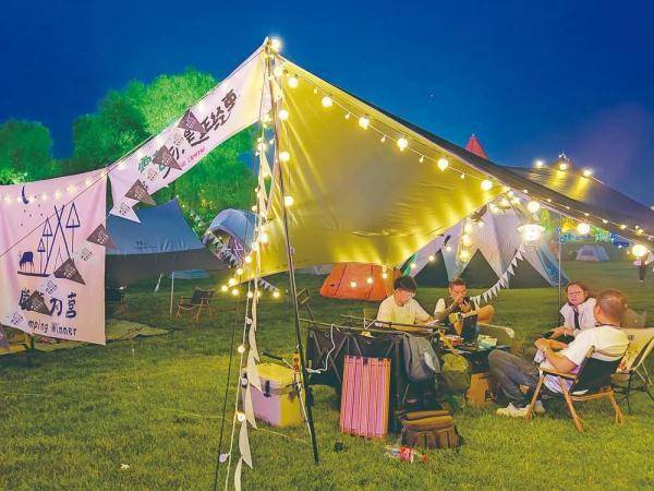 一些网红露营地,“露营+”不断玩出新花样。“柏里水乡的星宿海露营地涵盖了大福地、南鱼岛六礼花园、东松岛银杏林三大湖畔特色营地,将户外生活方式与美食、观景、艺术、游乐等不同元素相结合,为游客提供多种方式的露营活动。”柏里水乡市场营销总监白晓东介绍,在这里,游客不仅可以体验露营烧烤和星空电影,生日派对、亲子活动等也是营地开展比较多的活动。此外,景区还有民俗街区、主题民宿、生态康养等特色功能区,游玩体验丰富。