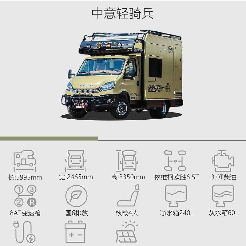 中意轻骑兵基于依维柯欧胜6.5吨底盘打造,动力上搭载3.0T柴油发动机,最大功率125kW,峰值扭矩400牛·米,与其匹配的是8挡手自一体变速箱。该底盘最大总质量达到了6.5吨,承载能力和舒适性都要强于普通底盘。