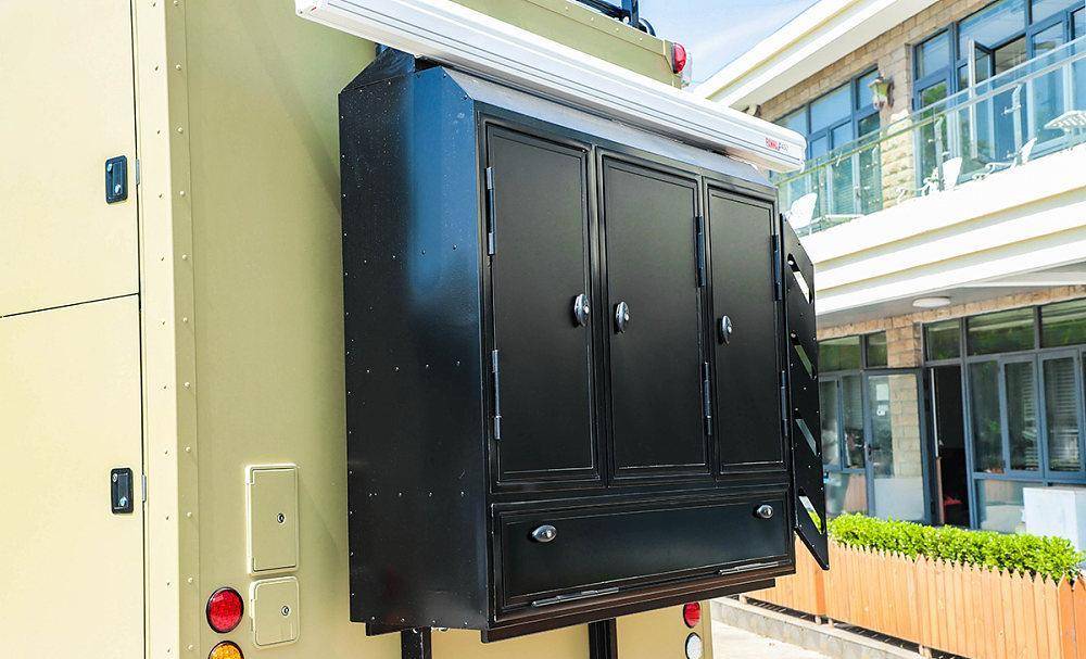 中意轻骑兵外部配有丰富的储物舱,电池组、检修区隐藏在舱门内部,用户便于检修,同时也能对内部设施进行有效保护。车尾配备了电动升降行李箱(电动需选装),旁边还设有单独的外放电接口、接水口,当我们将行李箱完全降低后打开后方遮阳帘可以形成简单的露营区。