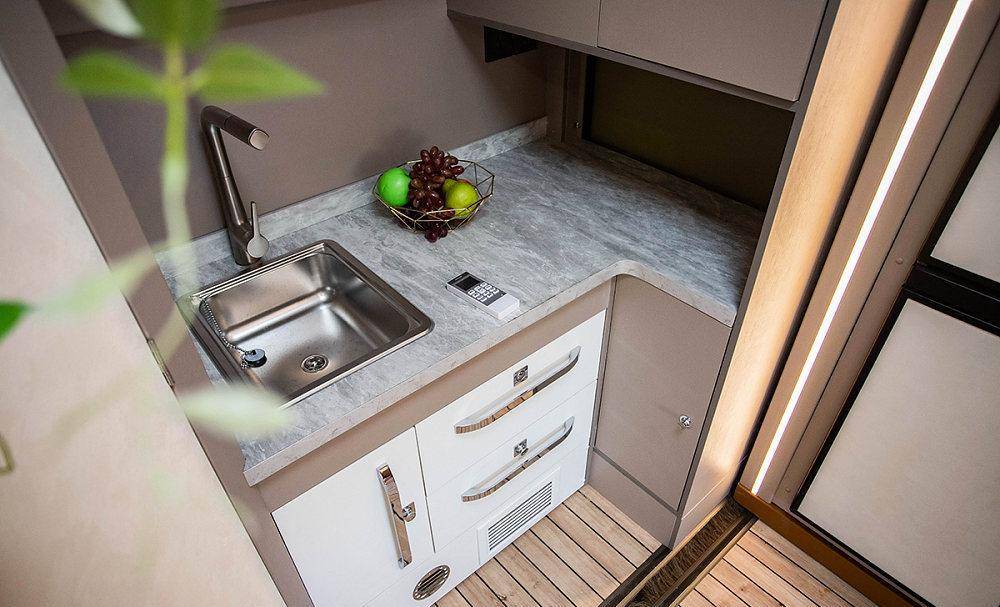 尾置厨房区紧凑,功能性丝毫不减,台面内嵌有不锈钢洗手池,另一侧的台面当作操作台、电磁炉放置区使用。