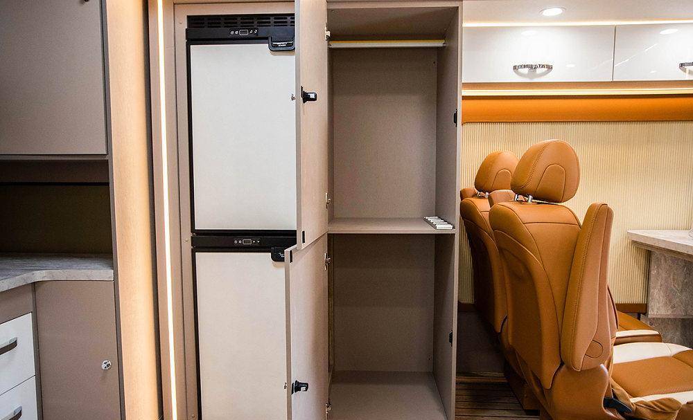 座椅后方设有两个容量很大的储物柜,叠物、挂物均可存放在内部,152L 12V车载冰箱设置在拓展舱内部,支持冷藏/冷冻功能,方便放置旅居所需的大量食材。