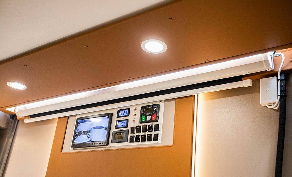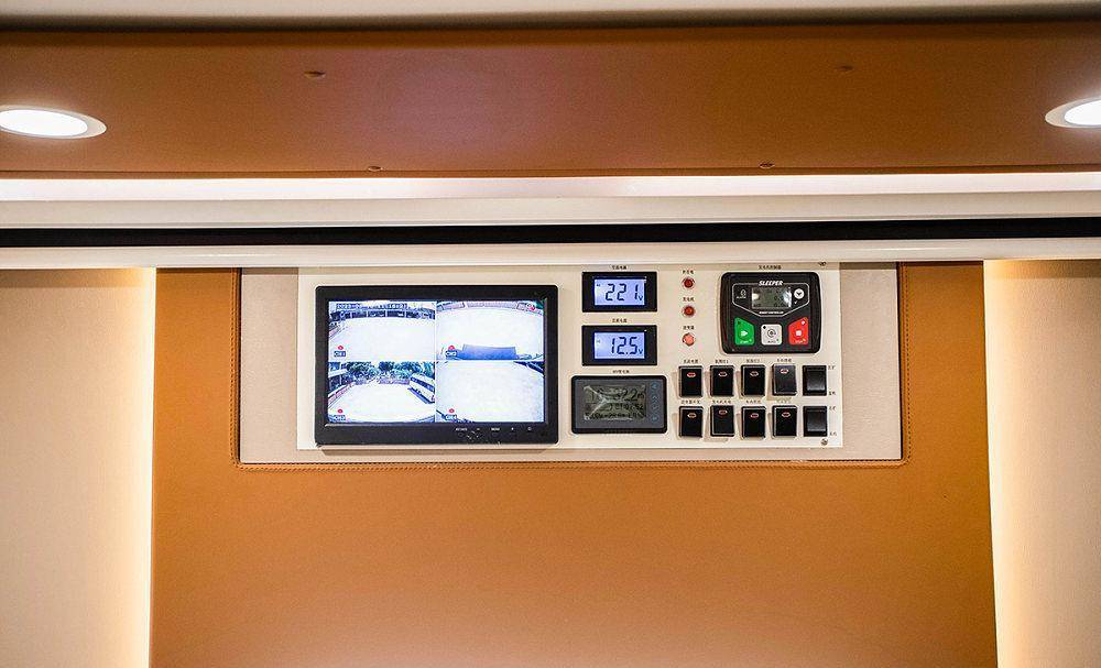 台面上方设置有微波炉,便于用户快速加热食材。中间的操作模块分别是后行车暖风系统开关、柴油暖风机开关、伟巴斯燃油加热器、水泵开关等,顶部的驻车家用空调在夏季可为车内提供冷风供应。