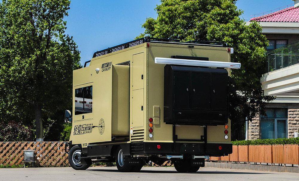 中意轻骑兵采用对向双拓展+伸缩卫浴间设计,电机、轨道、骨架等复杂的配套设施对车身承载力及厢体强度都是不小的挑战,除了新车选择了依维柯6.5吨底盘作为基础外,所有拓展结构源于中意自主开发的军用方舱扩展技术,肉眼可见的高强度槽钢作为支撑,进一步提升负载能力,另外在车内亏电状态下,拓展舱还能通过手动收回。