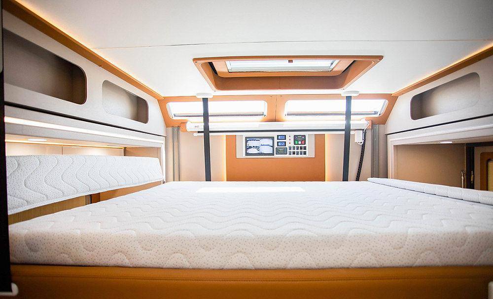 吊床左右两侧提供储物格,前方分体式天窗可为内部进行采光,并且内置遮阳帘,顶部天窗是通往车顶的方式之一,此时利用升降床还能起到升降电梯的效果。