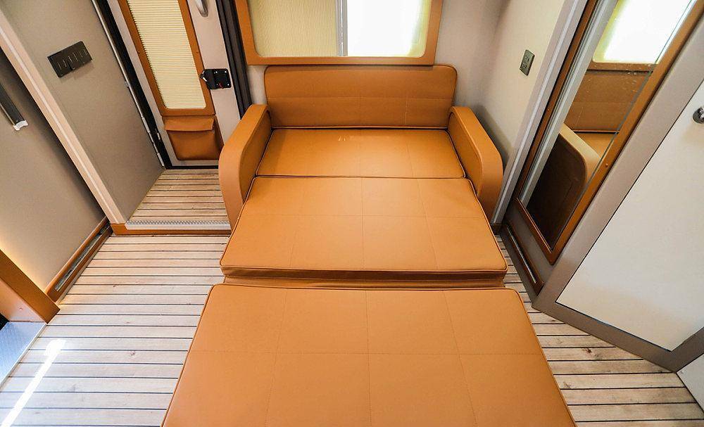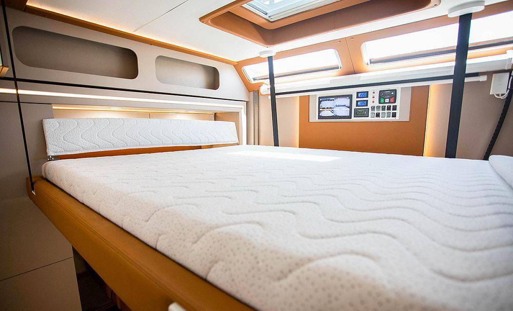 将拓展舱完全展开后,会客区顶部吊床才能正常升降,完全降低后,丝毫不影响沙发床的使用,新车至少预留出了4人的床位。