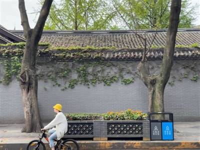 记者走访支矶石街时发现,虽然这里距离热闹的宽窄巷子不远,但整条街充满静谧的氛围。街道的路面干净整洁,没有任何垃圾;街道两旁绿化花桶中花团锦簇,绿化带中郁郁葱葱,爬山虎藤蔓为街边青色砖瓦墙披上“绿衣”,道路两旁的银杏树枝叶繁茂,让街道更加亮丽。整条街道古韵十足,墙面上的青色砖瓦、刻在铜板上的古诗词、立于绿化带旁铜碑上的典故,还有街道墙面上的文字砖,在装点街道的同时,也增添了文化氛围。