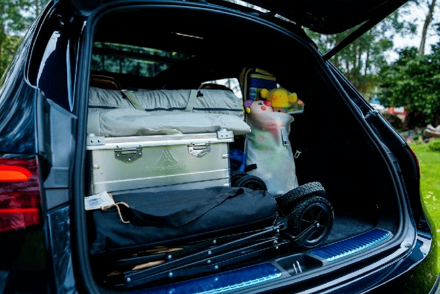 这样设计的首个好处,就是车身尺寸进一步加大,能够承载多人出行时满满当当的行李和露营装备。可别小看这一点,拿露营来说,规格提高一小步,携带的东西数量就得翻倍。专业帐篷、折叠椅子、折叠桌都只是最基础的东西,野餐垫、睡袋、遮阳天幕、强光灯、防水大容量背包、照明灯等等……无穷尽也。