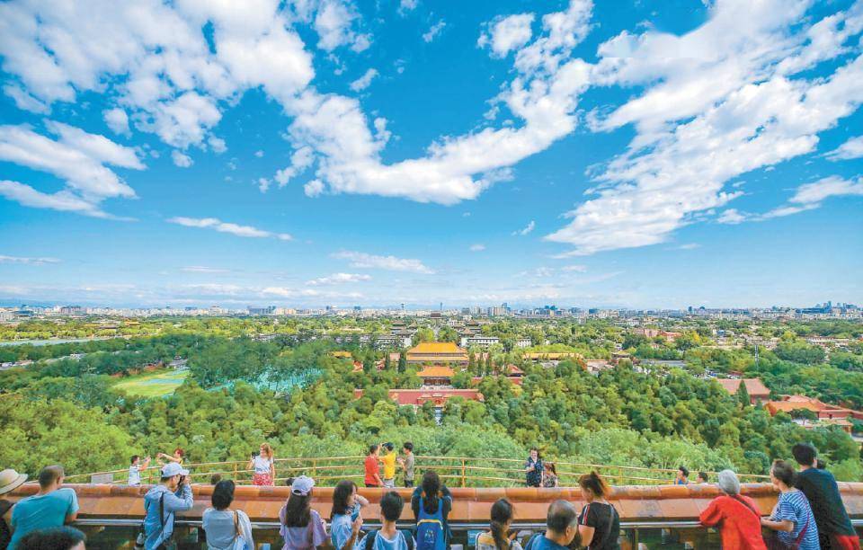 游人站在景山万春亭向北远眺,由近及远,蓝天白云下的鼓楼、北京奥林匹克塔、燕山山脉,依稀可辨。 本报记者 武亦彬摄
