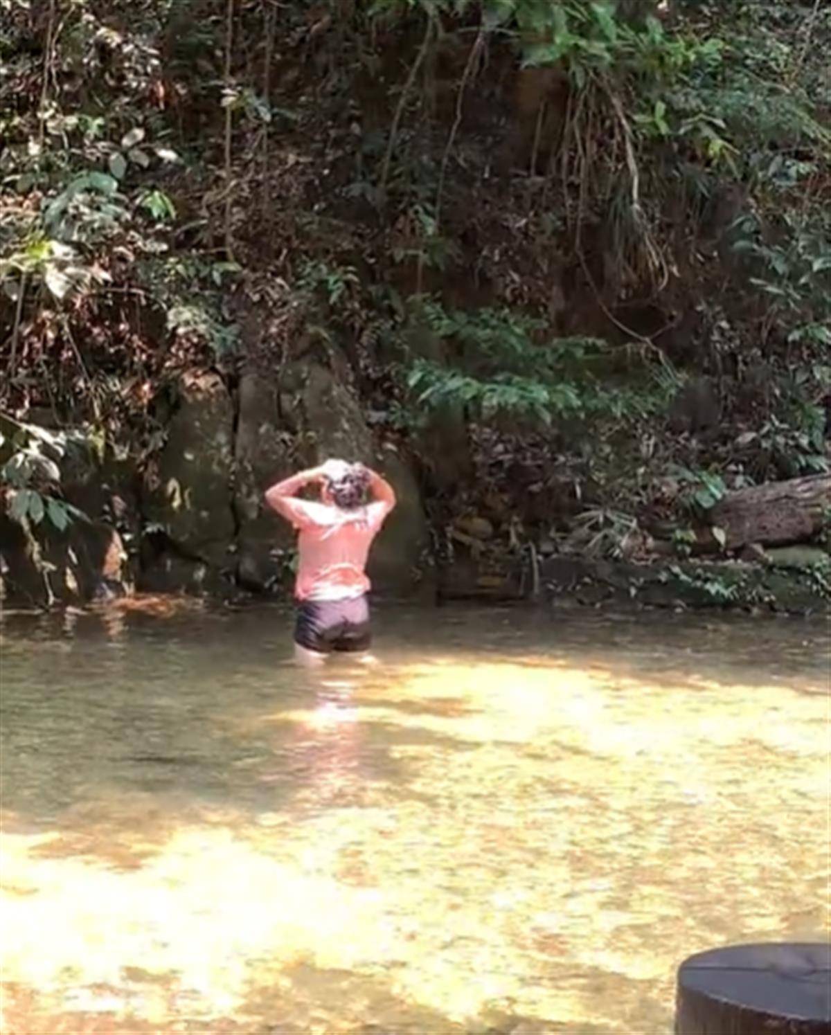 网友发布的视频显示,在一处依山溪流中,一名女子站立其中,正在洗头。其头发上有白色泡沫,应是使用了洗发水。之后她又俯下身,将头发浸入溪水中清洗。