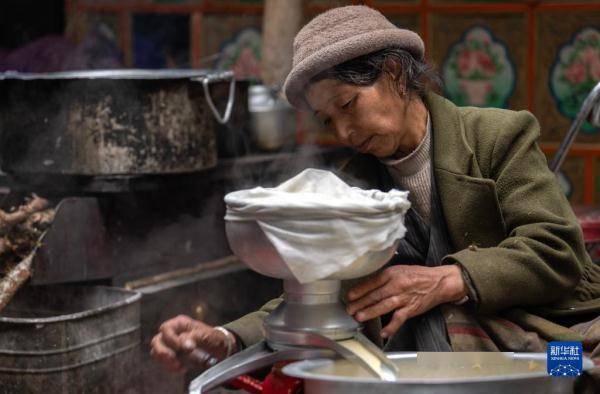 卓嘎在牧场的小屋里制作酥油(6月10日摄)。