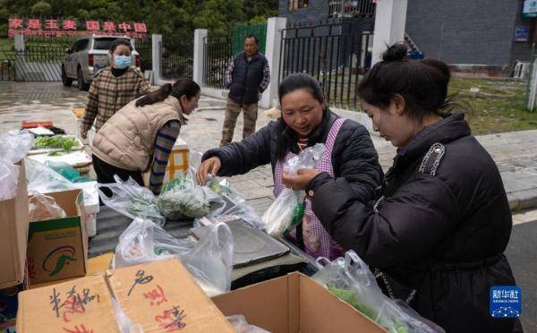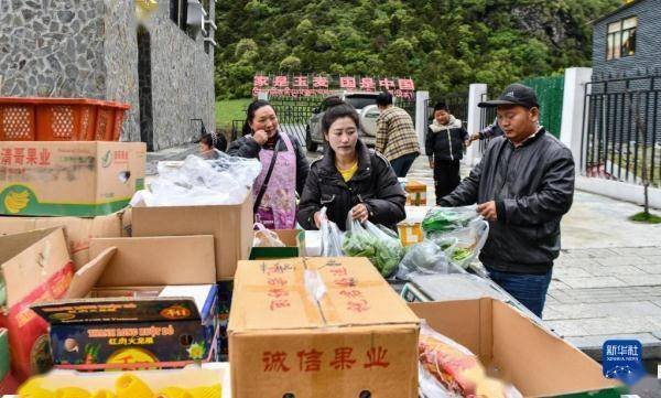 6月10日,来自隆子县的商人肖女士(右二)向玉麦乡的居民售卖水果和蔬菜。肖女士一个星期过来一趟。