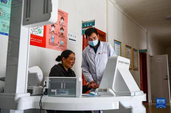 玉麦乡卫生院院长邱建亮(右)为玉麦居民乌金曲珍检查身体(6月10日摄)。