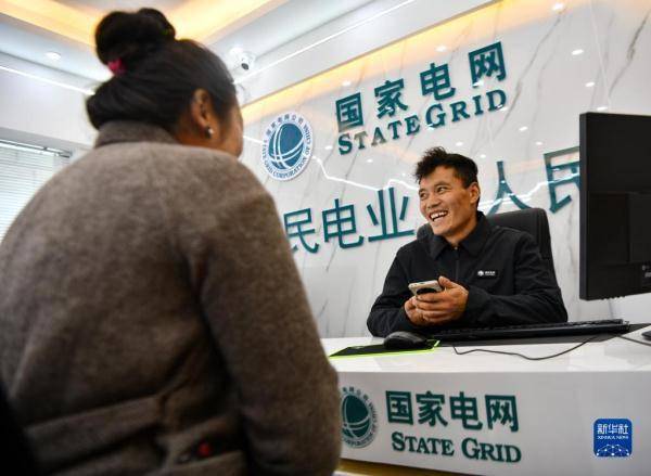 玉麦乡国家电网工作人员丹增桑珠为顾客充电费(6月10日摄)。