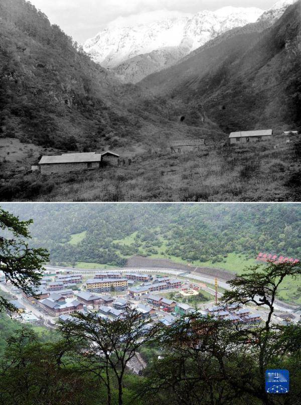这是一张拼版照片。上图为1997年9月拍摄的玉麦乡(新华社记者索朗罗布摄);下图为2023年6月10日拍摄的玉麦乡(新华社记者费茂华摄)。