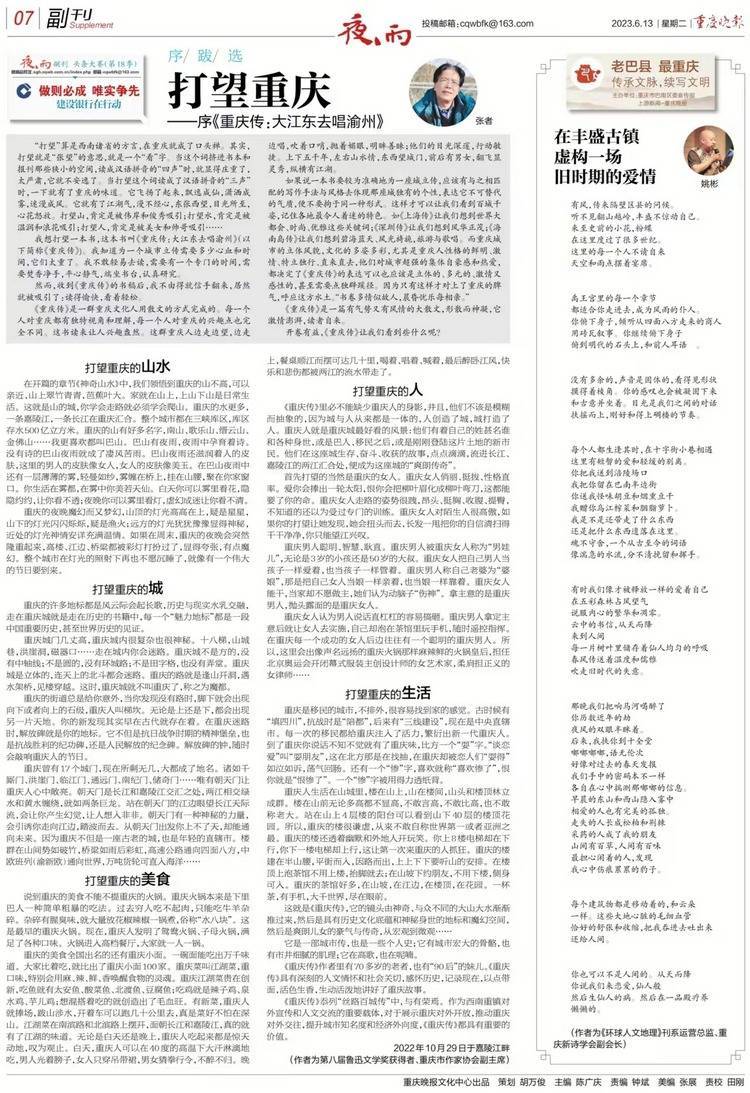 《重庆传》是一篇有气势又有风情的大散文,形散而神凝,它激情澎湃,读者自来。