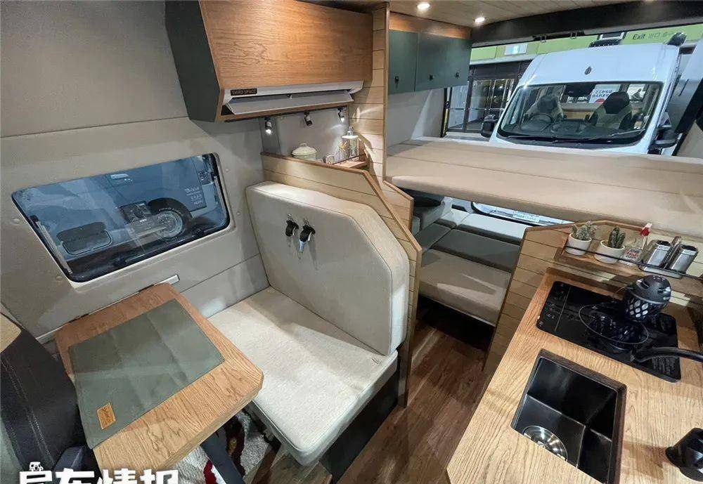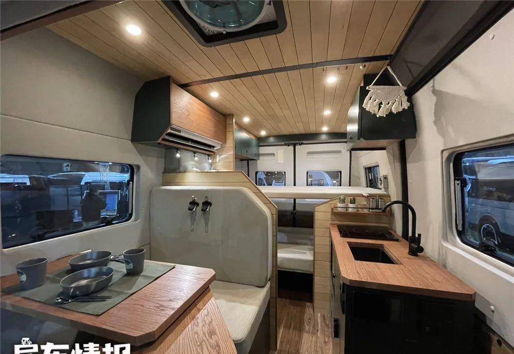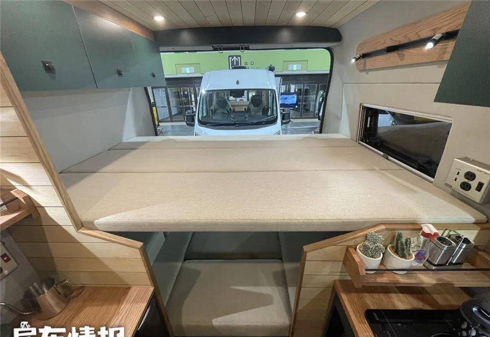 虽然是个日产车,但是来到车内,感觉布置上还挺有欧式风格的。运用大量木质家具餐桌,就连顶棚和地面都是木纹地板和木纹天花板。看起来十分亲近自然。另外还有绿色的橱柜,绿色的吊柜映衬,显得整个车内配色感觉很欢愉。布局方面,中间会客区域以及厨房的位置,尾部是上下铺睡卧区。