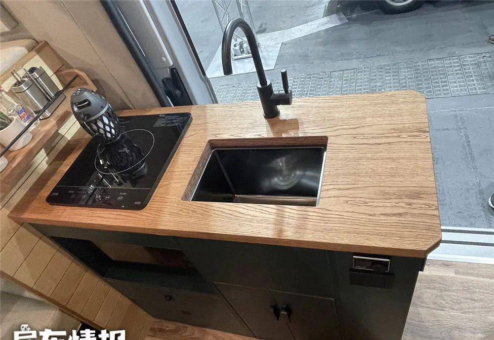 厨房区域采用了绿色的橱柜设计,我觉得这个颜色特别的好看,料理台面采用木纹饰板,与整车风格统一,配有一个电磁炉,这样我们就可以烹饪各种美食了,一个不锈钢洗菜池,和高脚水龙头,在侧边的墙壁上还有储物格,可以放一些调料瓶。厨房上面储物吊柜。头顶天花板也全部铺设了木板,并配有双向换气扇。