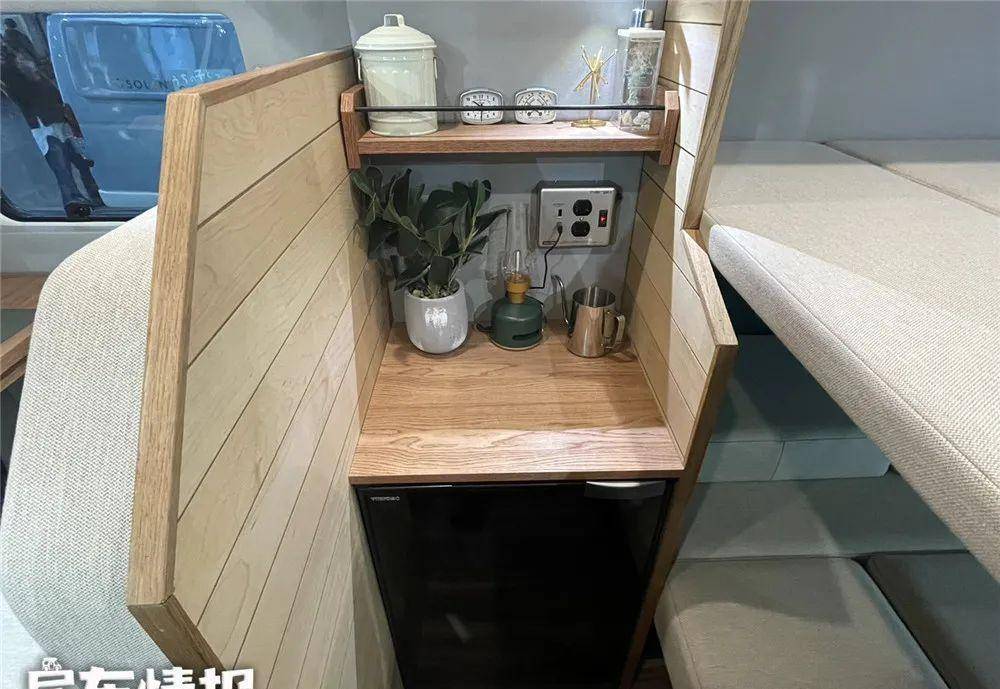 座椅身后头顶上方配有家用变频空调,并且做了隐藏设计,隐藏在木纹饰板内,木纹饰板的加持与整车设计风格十分和谐统一。下方冰箱,和储物格,冰箱上也做了木纹隔板。这里放一些花花草草,一下子,车内就变得生机盎然起来了。旁边电源插座在这里可以插一个小夜灯,或者给手机充电等。