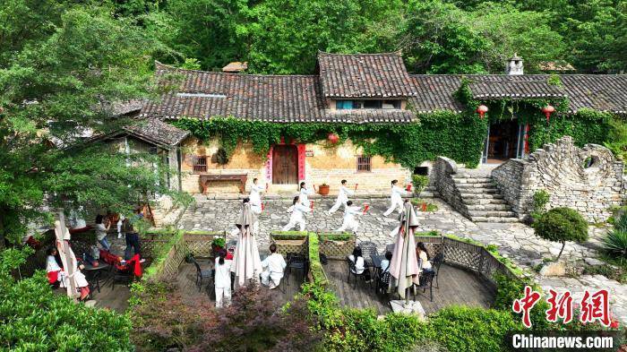 游客在由古民居改造的民宿前观看太极功夫扇表演 周星亮 摄