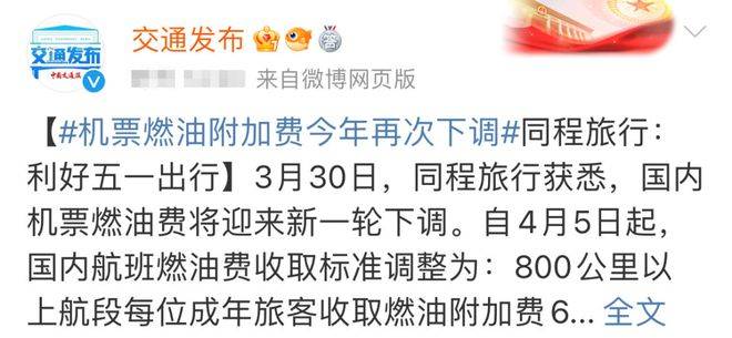 据“中国交通报”微博消息,4月5日零时(出票日期)起,国内航班燃油附加费征收标准将再次调整,迎来今年第二次下调。
