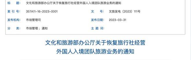 即日起恢复全国旅行社及在线旅游企业经营外国人入境团队旅游和“机票+酒店”业务。