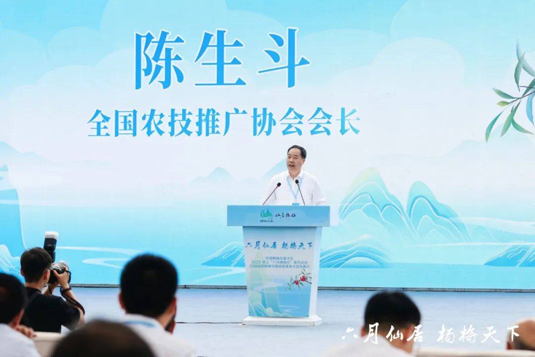 陈生斗在致辞中指出,仙居历史悠久、文化底蕴深厚,杨梅种植农户广泛、生产技术先进、产业体系完备、优势特色突出、产品质量优异、发展势头强劲。希望仙居再接再厉、乘势而上,坚持“政府主导、农民主体、社会参与”,通过科技支撑、数字赋能、创新驱动,进一步打造品牌、提升品质、增加效益;坚持以“龙头引领、三产融合、协同推进”,来进一步提高仙居杨梅的规范化、标准化、集约化水平,促进仙居杨梅绿色高质量发展,推动杨梅产业在乡村振兴和农民共同富裕的进程中发挥更大作用。