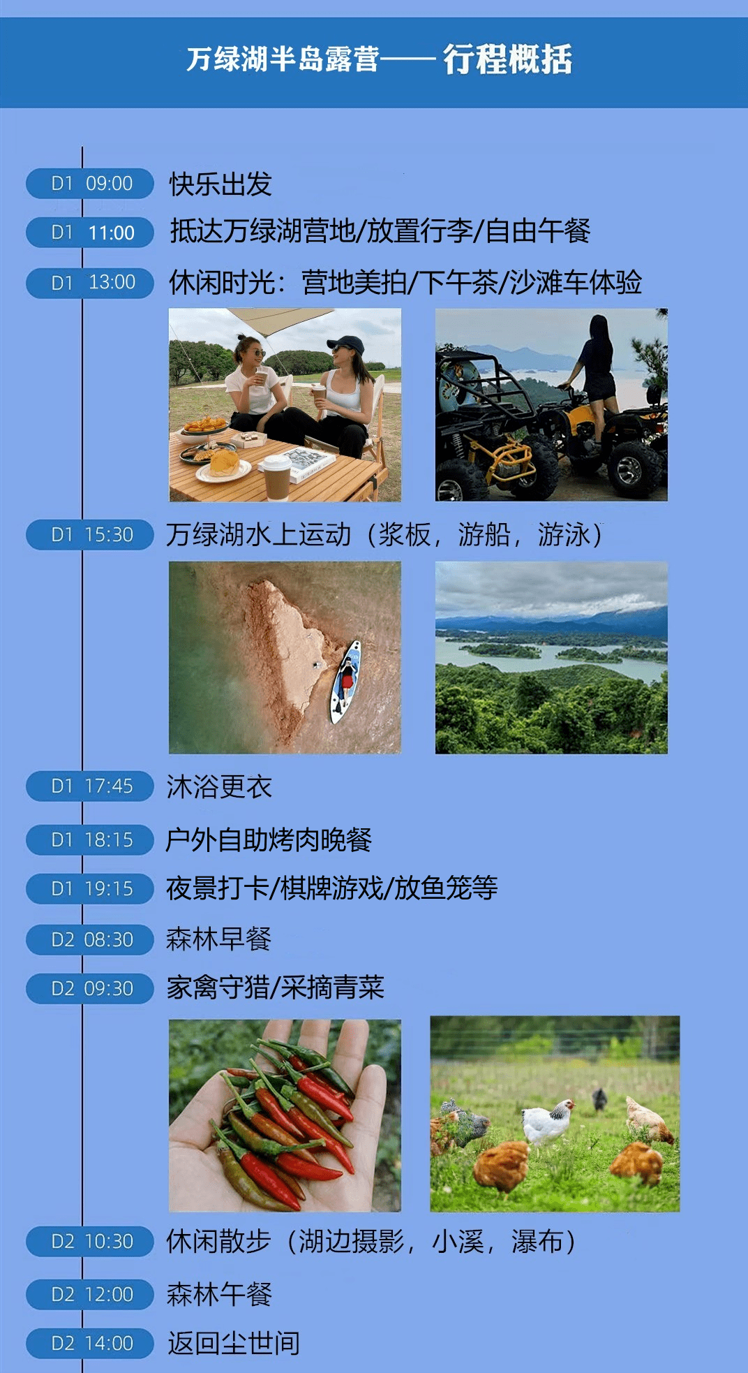 1、两个午餐自由安排,可自带食物,或订农家菜围餐(580起订/需提前半天下单)