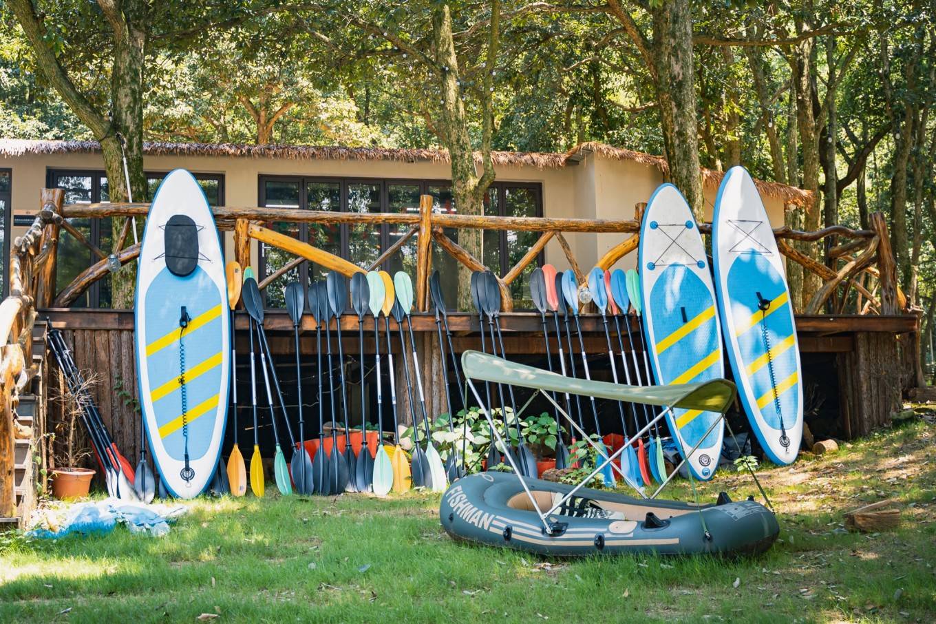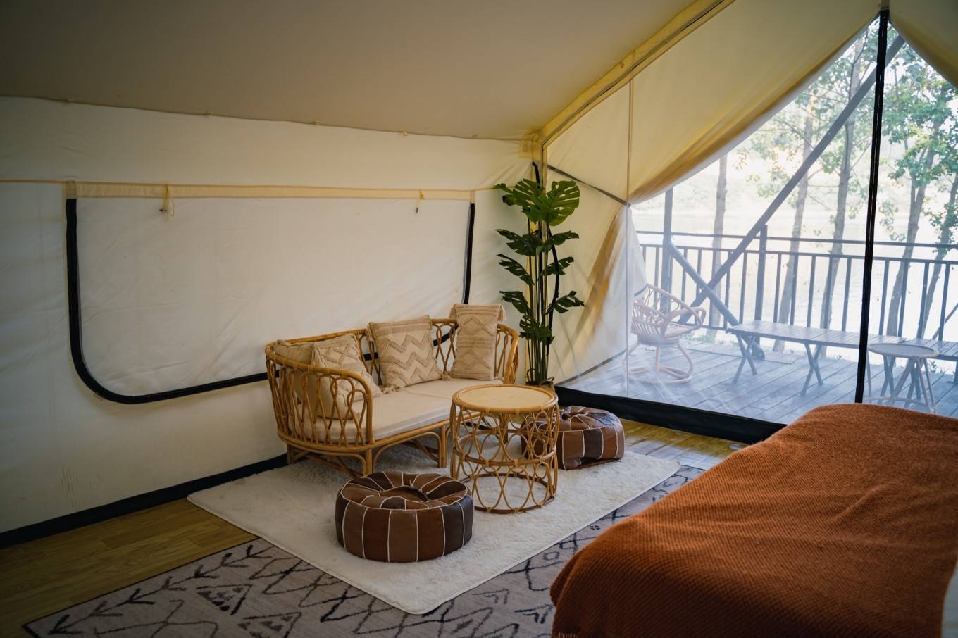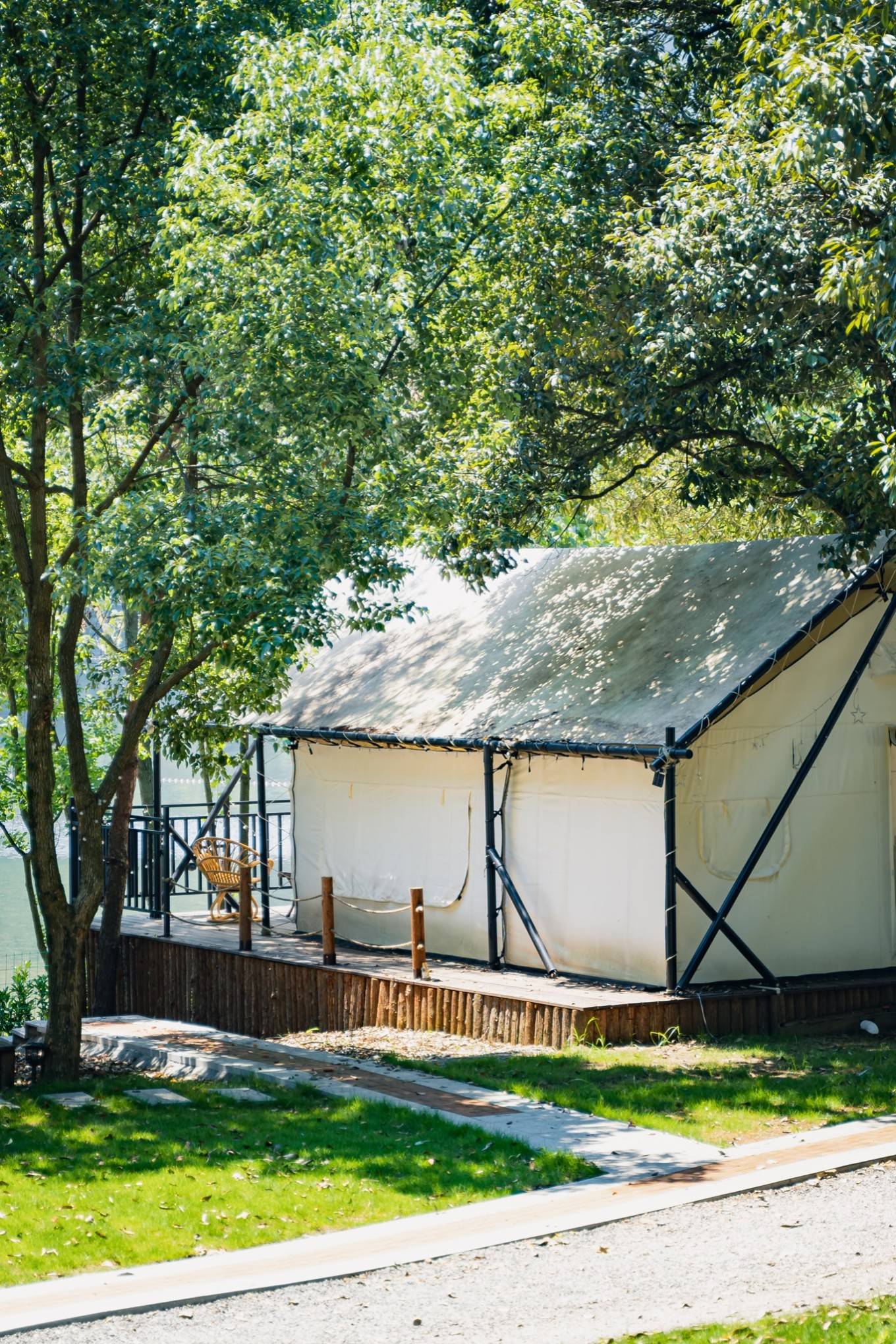 上岸以后,营地的帐篷拎包就可入住,非常适合露营小白以及亲子家庭,每一个帐篷都自成一个幽静的小天地,隐在绿荫里,且与其他营房保持一定的安全距离,还配有一个户外露台,或对着山野或对着湖光,很是享受。