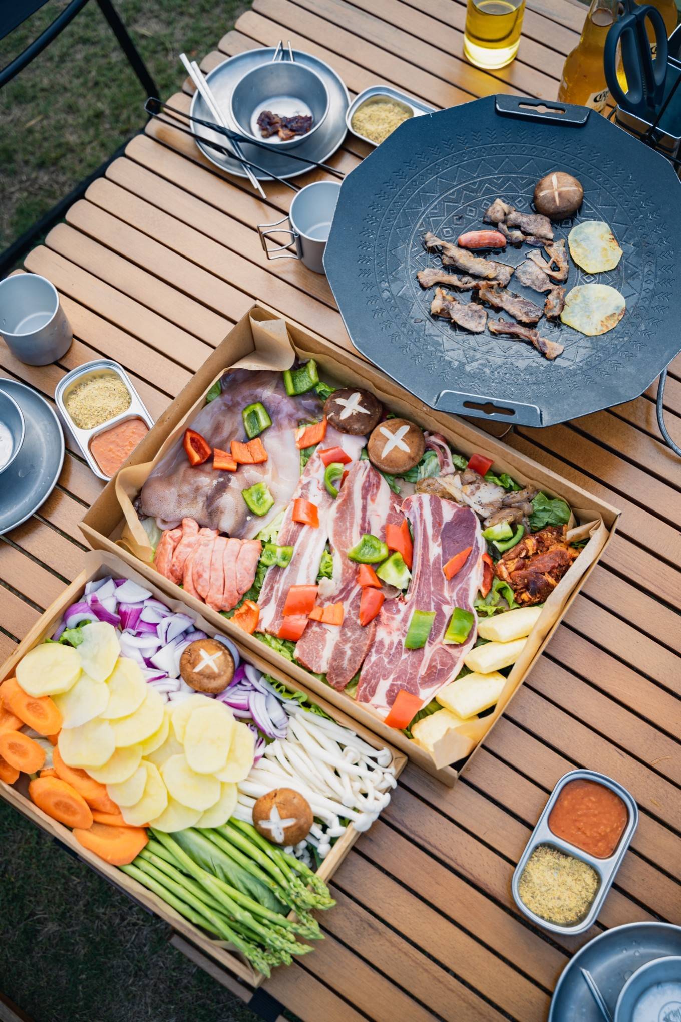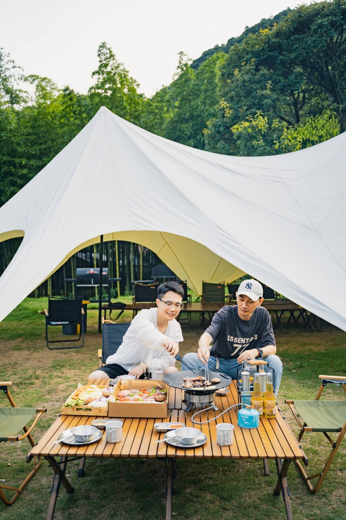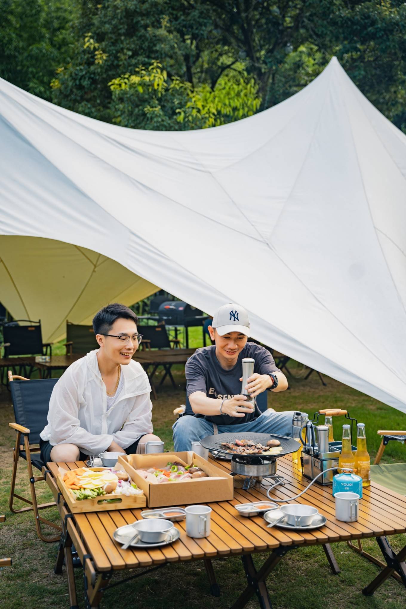 营地根据人数搭配伙伴,每个帐篷都有烧烤架和烤肉架,团队里有一个会做饭的人,就不怕没吃的。