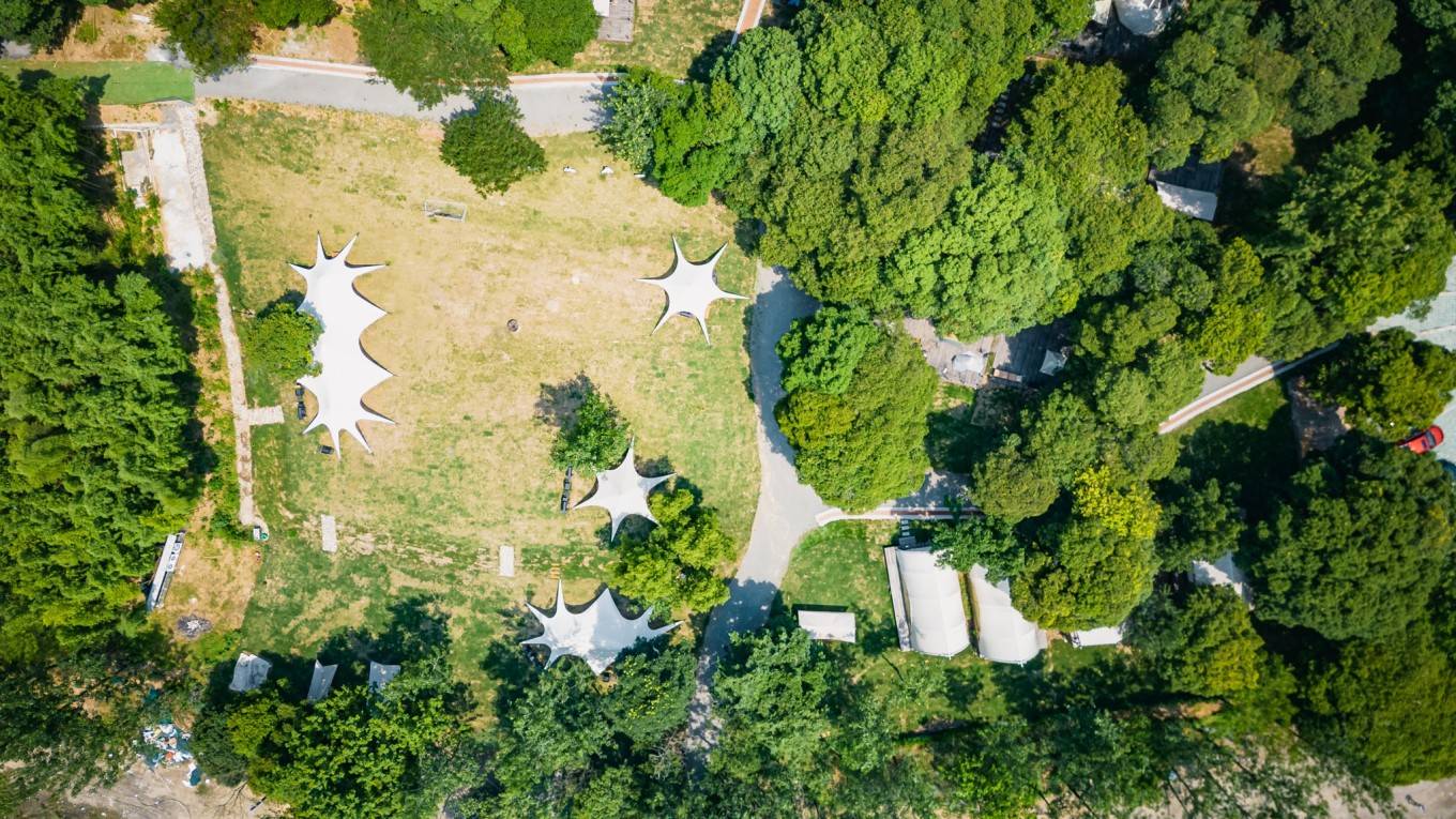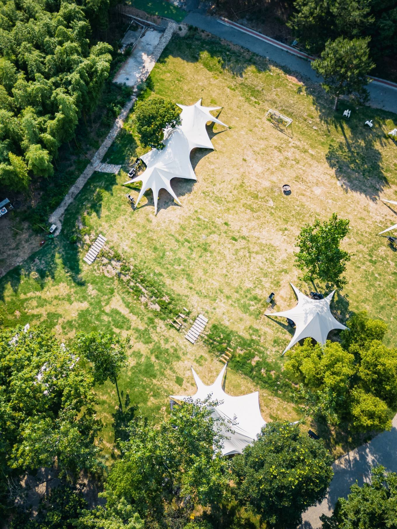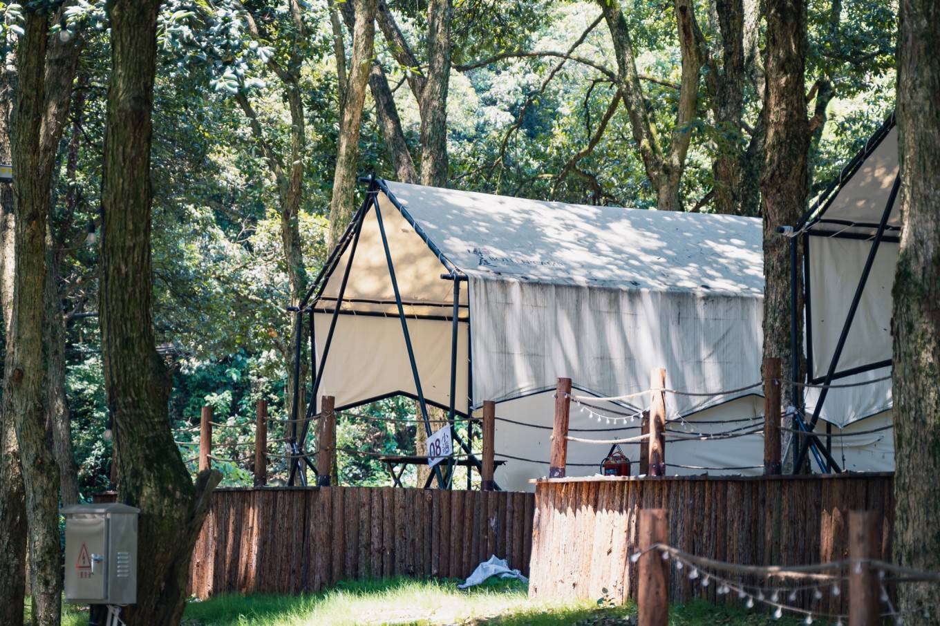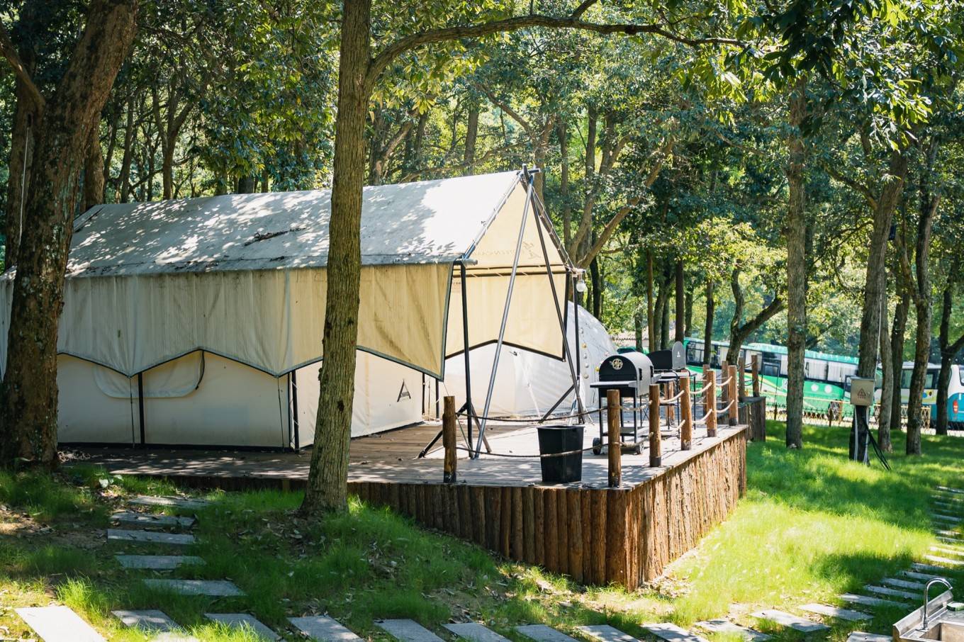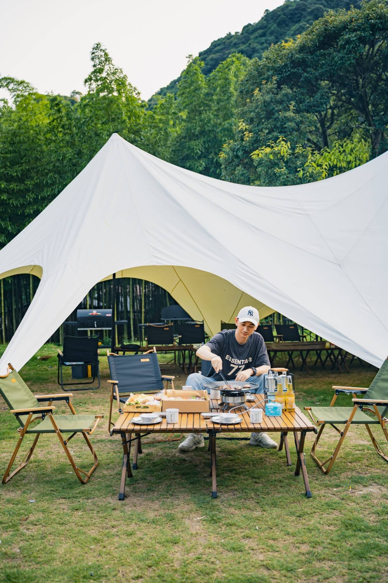 富春 桃源 星辰山海营地位于逍遥岩岭湖畔的森林中,远处青山黛色湖水清澈、近处满目葱绿鸟语花香,置身其中,身心都能感受到宁静。