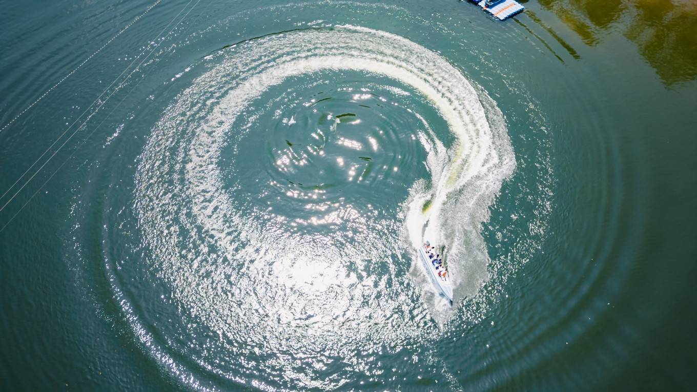 游艇在湖上画圈漂移,形成了一圈浪漫的水花。