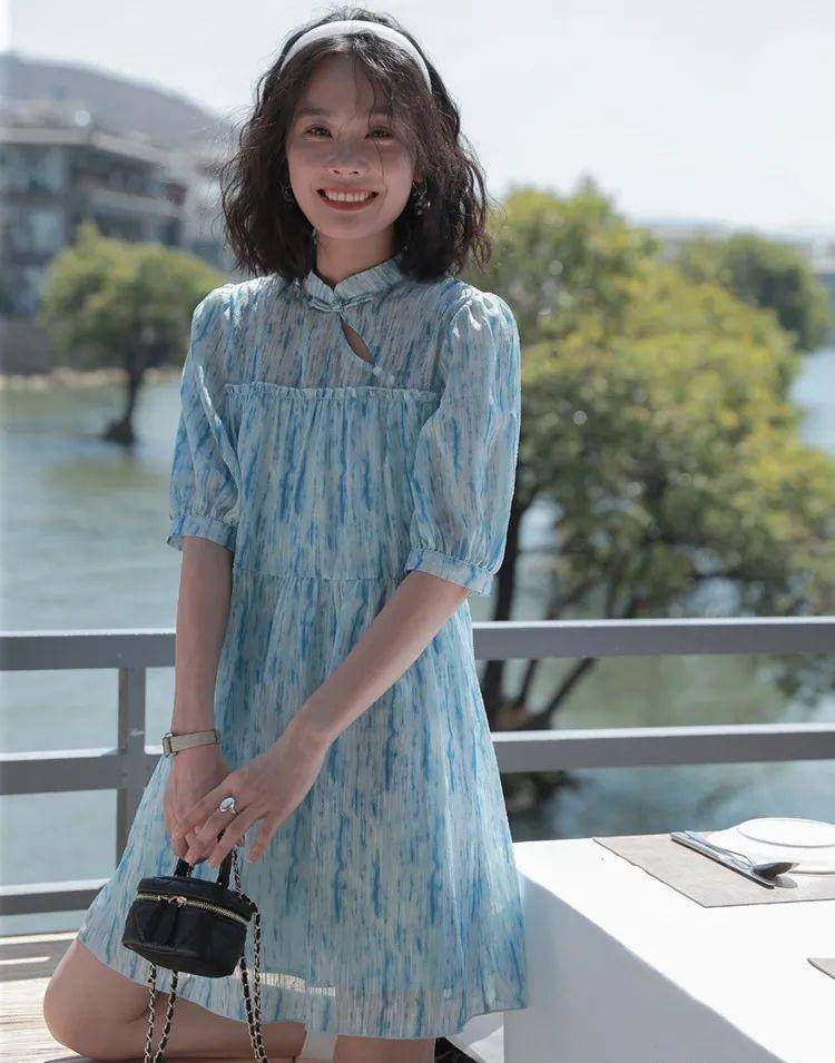 升级款中式旗袍款蓝色雪纺连衣裙